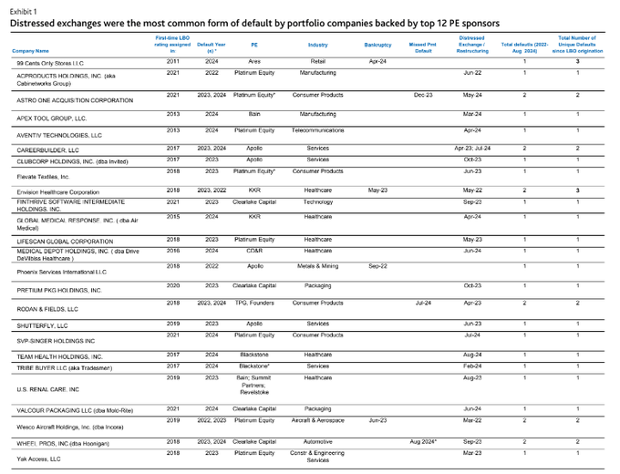 Distressed exchanges (DEs) were the most common default type between January 2022 and August 2024 across all PE-owned debt issuers. This data reinforces an ongoing trend of private equity sponsors heavily favoring DEs as a debt restructuring tool, which helps them sidestep a costly bankruptcy process and preserves their equity.”