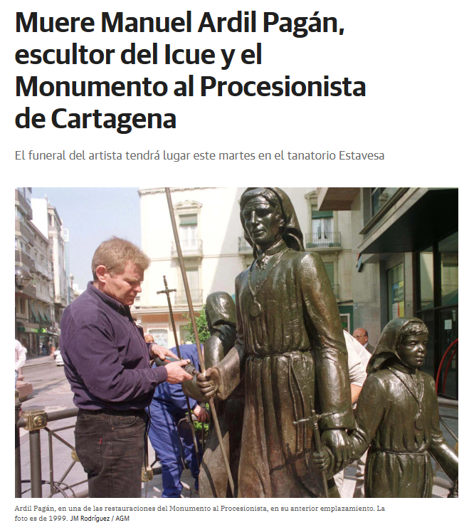 Hoy día 9 de diciembre de 2024 ha fallecido el escultor cartagenero Manuel Ardil Pagán al que debemos esculturas emblemáticas que se encuentran en nuestras calles, la más conocida, nuestro querido Icue y quiero rendirle este homenaje.
