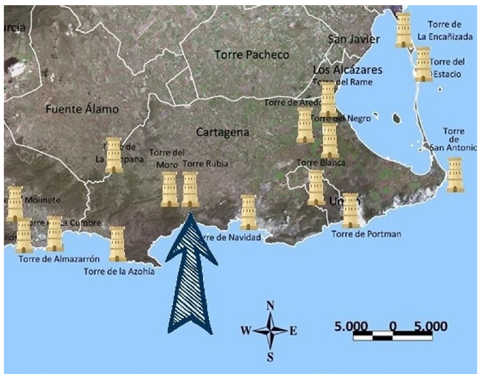 la Torre Rubia, Santa Elena, Negro o Moro, en pie en la actualidad, muchas de ellas desaparecieron entre los siglos XVIII – XIX, otras se transformaron como la Torre de Navidad (ahora Faro de Navidad y Fuerte de Navidad) o la de Cabo de Palos, ahora Faro de Cabo de Palos.