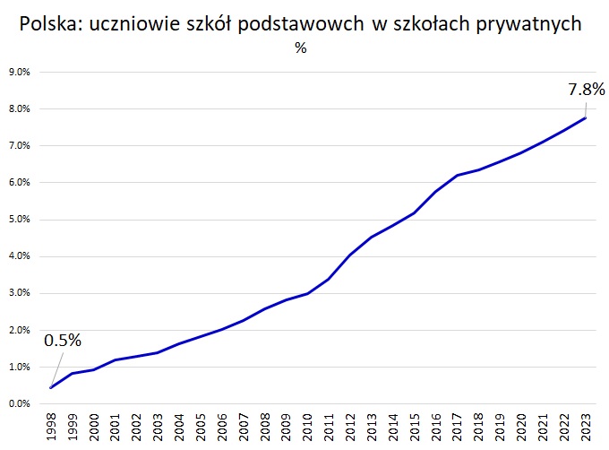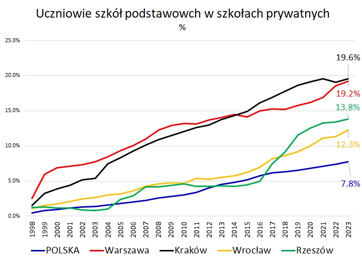 W większych ośrodkach miejskich pomiędzy co piąty a co siódmy uczeń uczęszcza do prywatnej szkoły podstawowej. 2/13