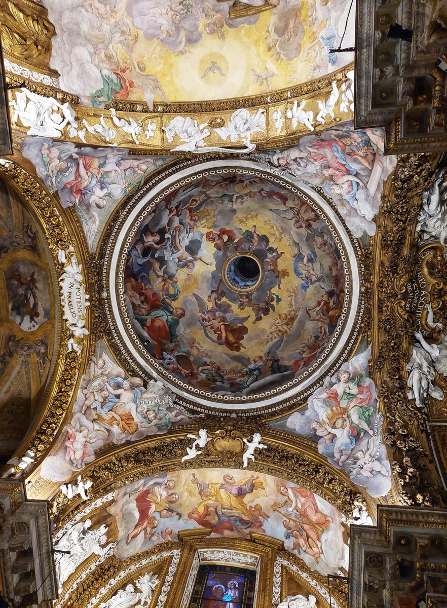 Poi, alzando gli occhi, ci ritroviamo sotto un tripudio di angeli sospesi, sognanti, tra stucchi bianchi e dorati, con questa ridondanza che ha lo scopo di stupire e sedurre.