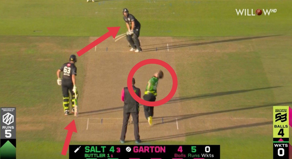 Here's an even more egregious example a few overs later in the 21st. Dean doesn't even have her bat grounded. She's left her crease early, at least six inches outside, with the bat dangling in the air, before the bowler has the ball even close to delivery.