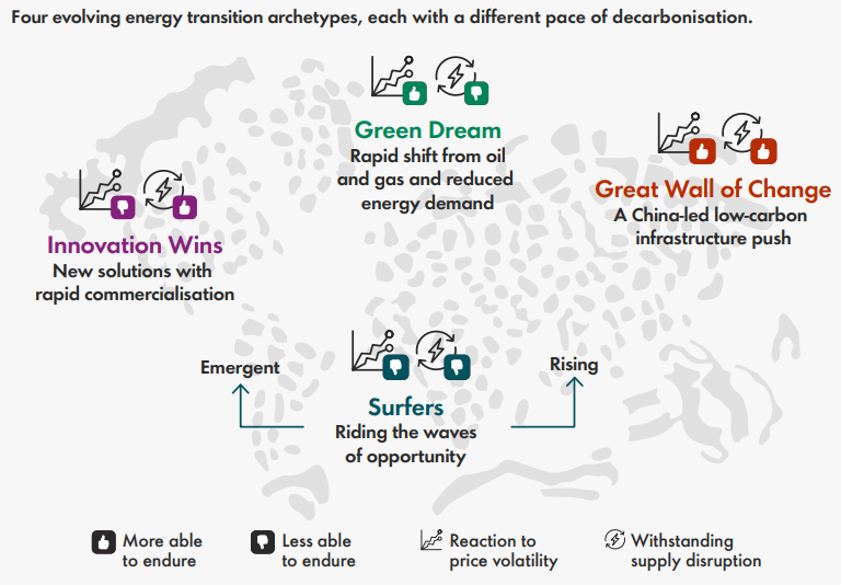 2/10 We've built two scenarios, Archipelagos and Sky 2050 from four evolving energy transition archetypes, each with a different pace of decarbonisation. Energy Transition means different things to different people depending on where you live and what access to energy you have.