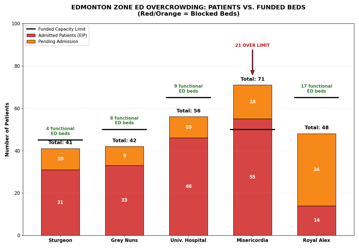 The entire EDM Zone is operating with ~ 38 FUNCTIONAL Emerg beds for the entire city! (worse if you consider the MIS is MINUS 21 beds over non-surge capacity)