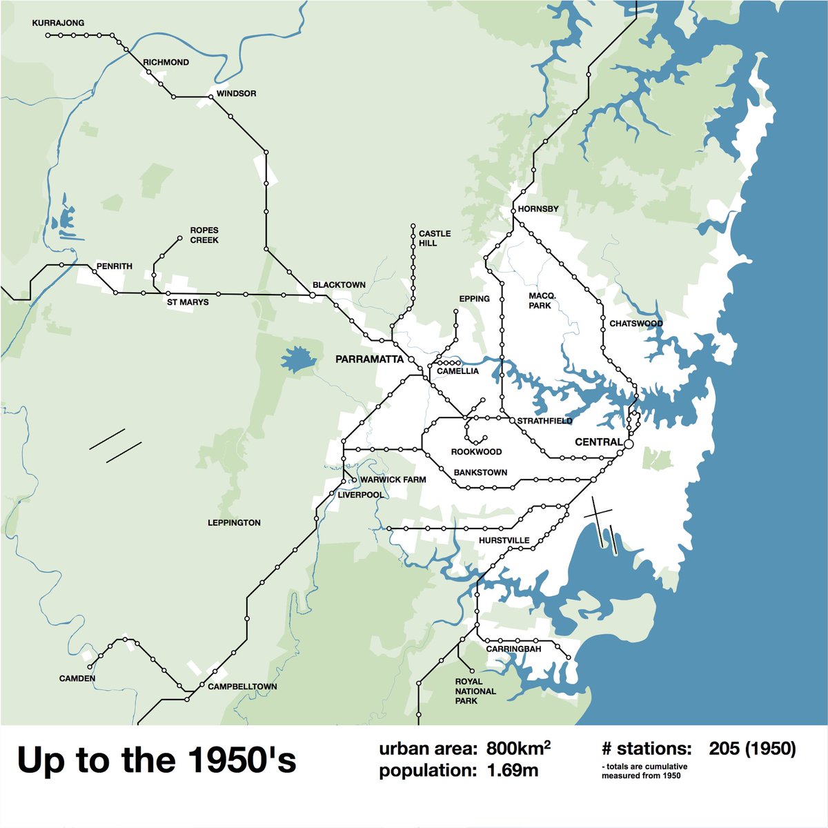 Reminder that Sydney was a great Public Transport city; 1. to 1950, 205 train stations serving population of 1.69mill over urban area of 800km2. Plus 350km tram system, multiple interchanges, myriad stops.