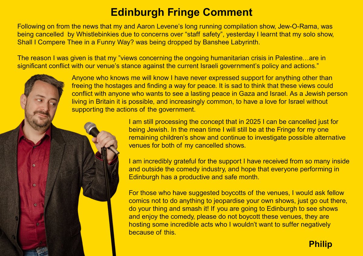 Following on from news my & Aaron Levene’s long running compilation show, Jew-O-Rama, was being cancelled by Whistlebinkies due to concerns over “staff safety”, yesterday I learnt that my solo show, Shall I Compere Thee in a Funny Way? was being dropped by Banshee Labyrinth.