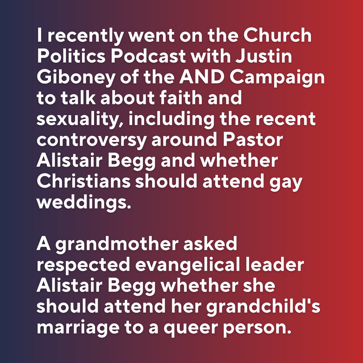I recently went on the Church Politics Podcast with @JustinEGiboney of the @AndCampaign to talk about faith and sexuality, including the recent controversy around Pastor Alistair Begg and whether Christians should attend gay weddings.🧵