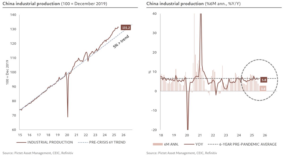 Our Q3 GDP nowcast points to a contraction of more than 2% q/q annualised, the weakest quarterly pace since early 2022 2/ Industrial production also slowed. While still ~4% above its pre-pandemic trend and up a decent 5.8% y/y, the 6-month annualised pace dropped to just 3.8%, down from more than 5% in June