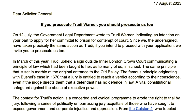 2. In July, the Solicitor General, Michael Tomlinson KC, threatened 68 year-old retired social worker, Trudi Warner, with contempt of court proceedings, for literally upholding the law on a sign