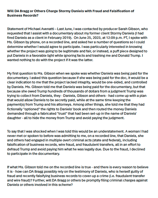 "On June 25th 2023 Avenatti was contacted by producer Sarah Gibson to assist with the Stormy Daniels documentary. Avenatti spoke with Ms. Gibson on a recorded line. Avenatti was told among other things, Drippy was being paid for the documentary. However, because Daniels owed Trump hundreds of thousands of dollars from a judgment Trump was trying to collect from Daniels, they - Daniels, Gibson and othersย - would allow Daniels to be secretly paid.