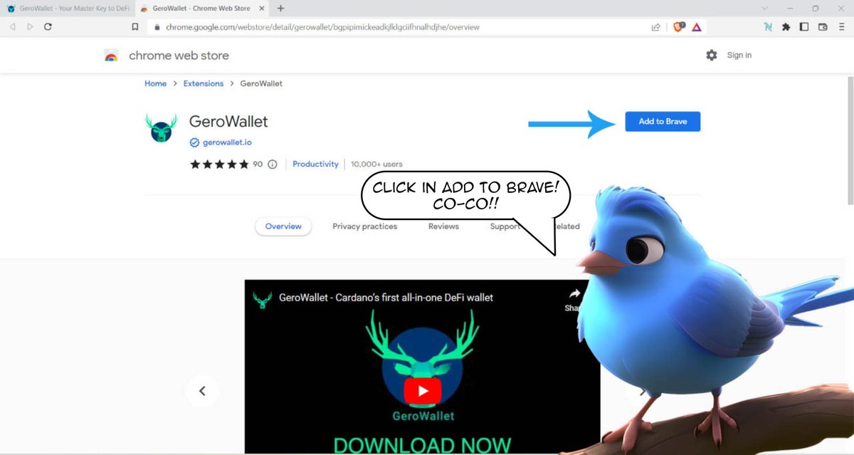 First, navigate to 'gerowallet.io' and click on the button 'Download'. It will redirect you to the extension of it in the Chrome Web Store. Then click on the button 'Add'.