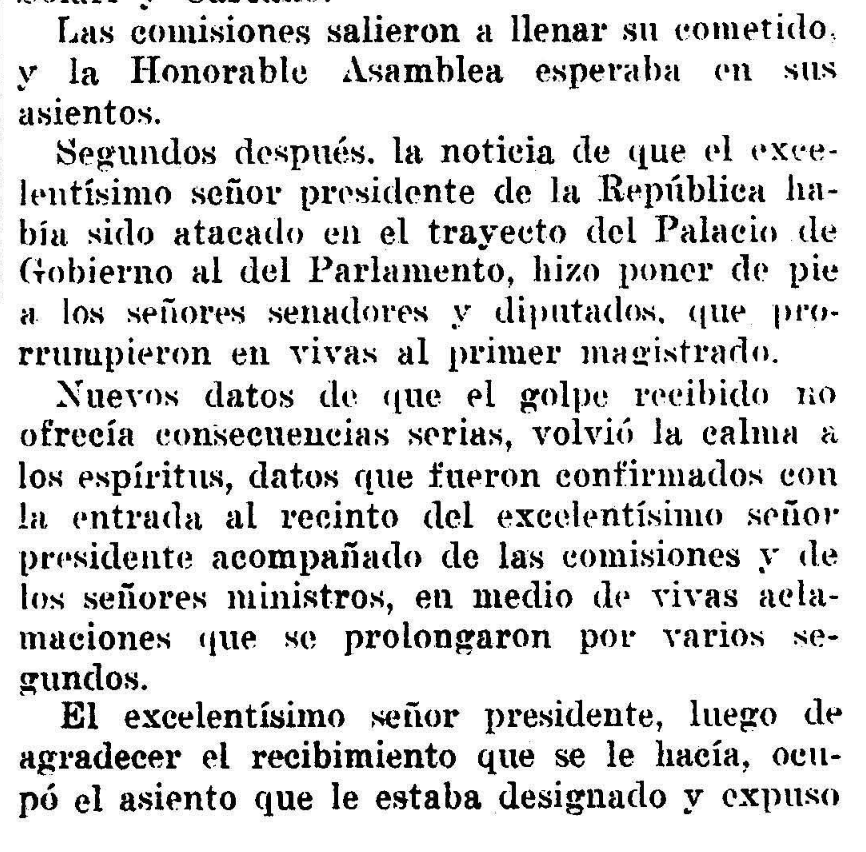 Al llegar a la puerta del Congreso, habiendo partido caminando desde Casa de Gobierno con su gabinete, fue herido con un cascote que impactó en la cabeza del mandatario.