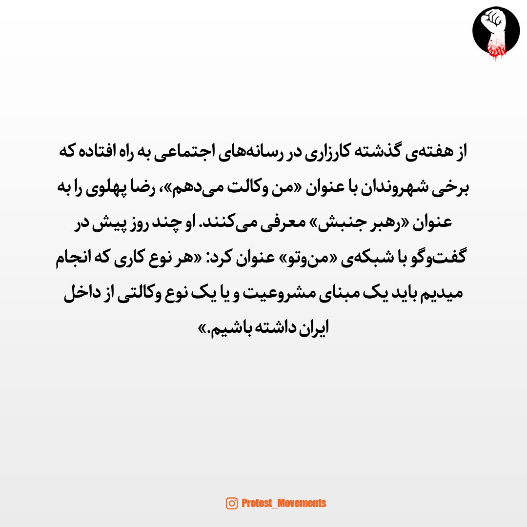 ۱. از هفتهی گذشته کارزاری در رسانههای اجتماعی به راه افتاده که برخی شهروندان با عنوان «من وکالت میدهم»، رضا پهلوی را به عنوان «رهبر جنبش» معرفی میکنند. او چند روز پیش در گفتوگو با شبکهی «منوتو» عنوان کرد: ...