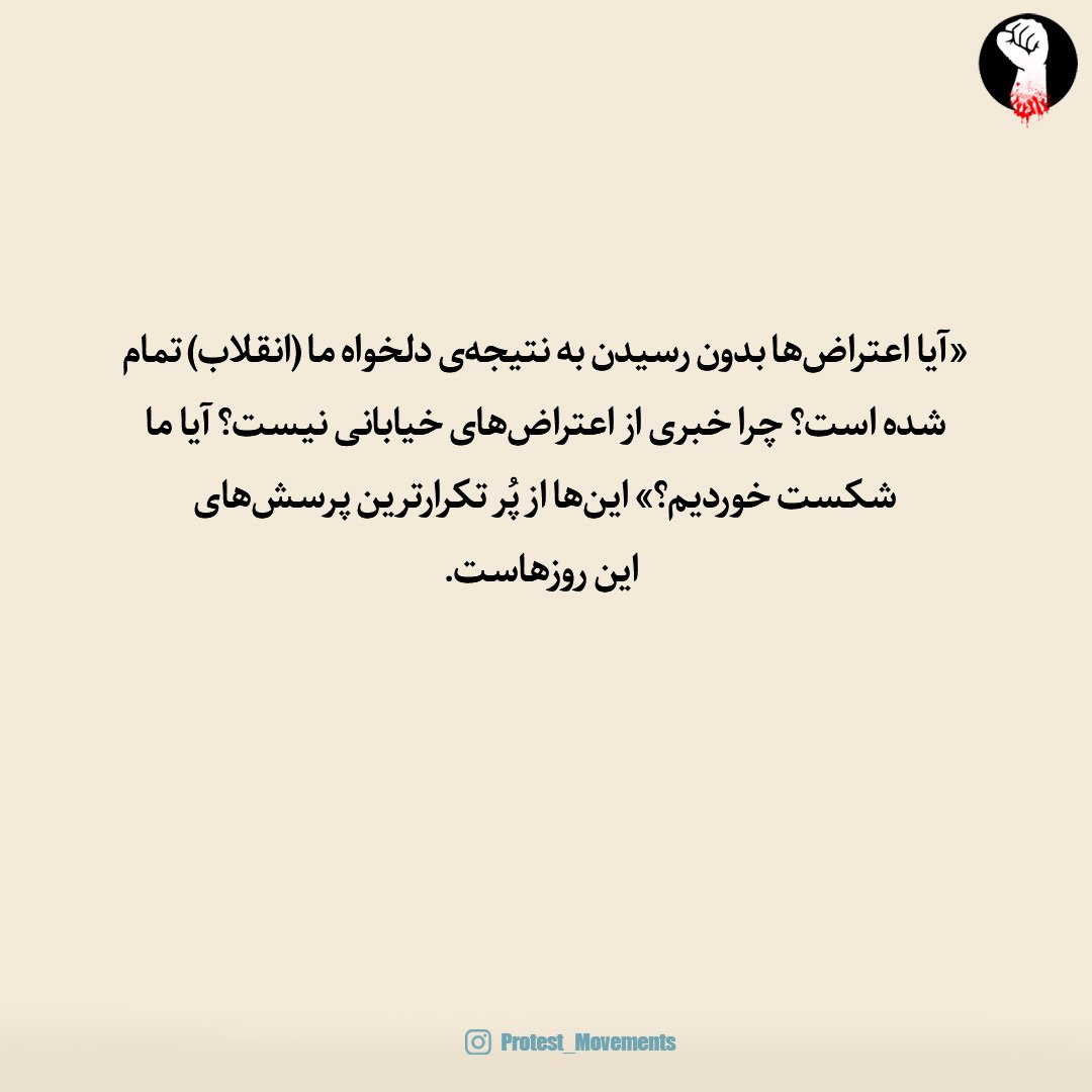 ۱. «آیا اعتراضها بدون رسیدن به نتیجهی دلخواه ما (انقلاب) تمام شده است؟ چرا خبری از اعتراضهای خیابانی نیست؟ آیا ما شکست خوردیم؟» اینها از پُر تکرارترین پرسشهای این روزهاست.
