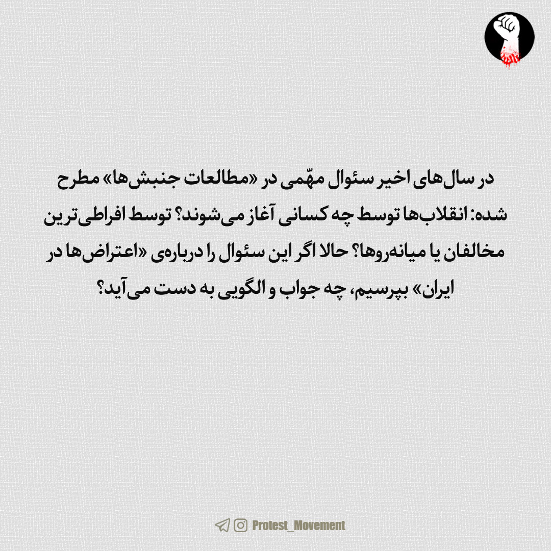 ۱. در سالهای اخیر سئوالهای مهّمی در «مطالعات جنبشها» مطرح شده: انقلابها توسط چه کسانی آغاز میشود؟ توسط افراطیترین مخالفان یا میانهروها؟ حالا اگر این سئوال را دربارهی «اعتراضها در ایران» بپرسیم، چه جواب و الگویی به دست میآید؟