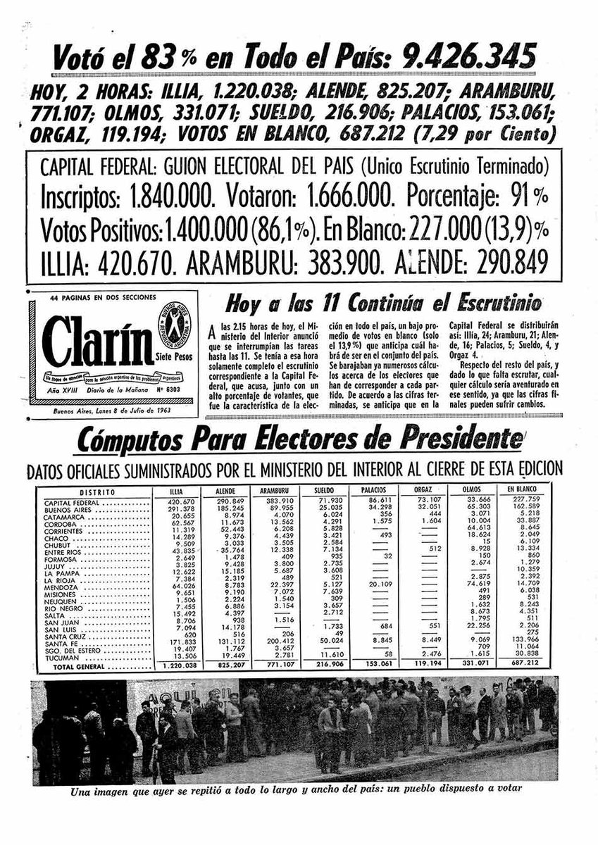 Segundo, quedó el voto en blanco (1,8 millón), impulsado por Arturo Frondizi y Juan Perón.