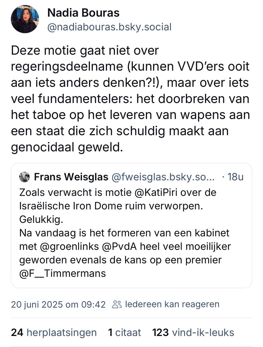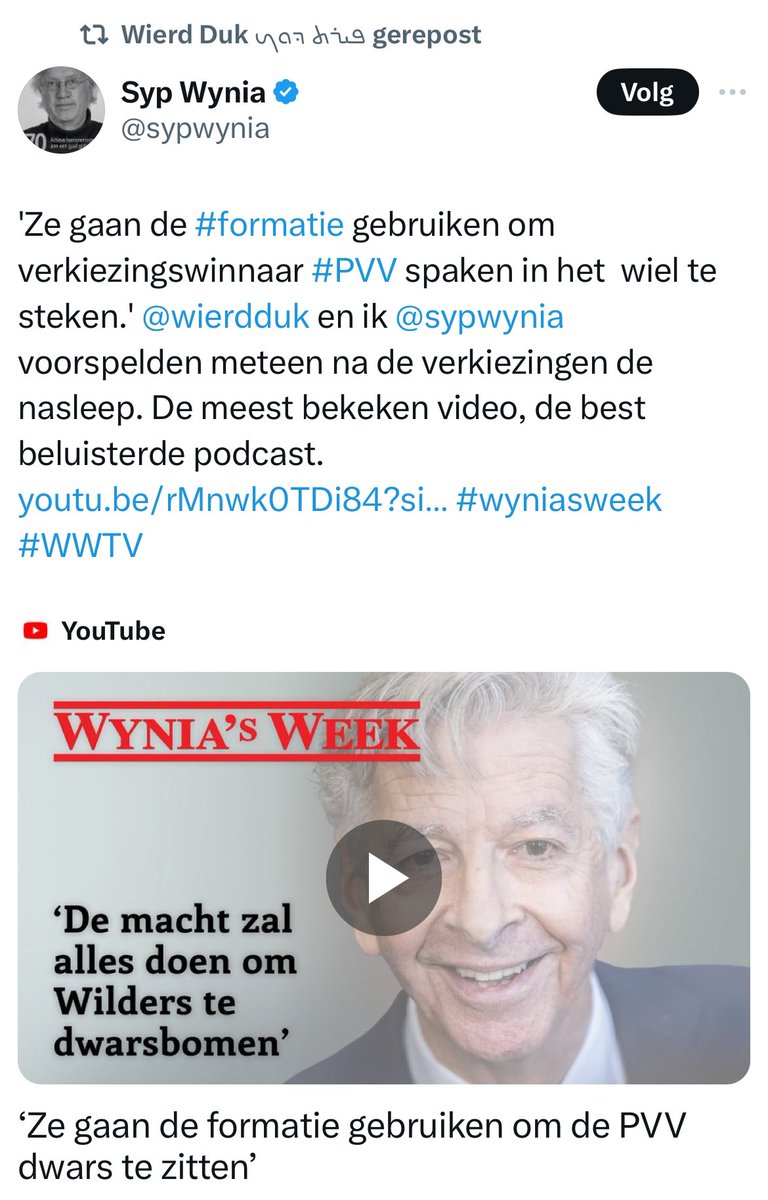 https://twitter.com/rpj_hendriks/status/1932447571257245807• Wierd Duk: “Ok. Stel nou: je blijft bij je punt, hè. Dat is altijd maar de vraag in de politiek, maar stel nou je wil écht niet met die PVV in zee zo meteen. Dan blijft alléén Timmermans over! Die heeft een smaldeel…