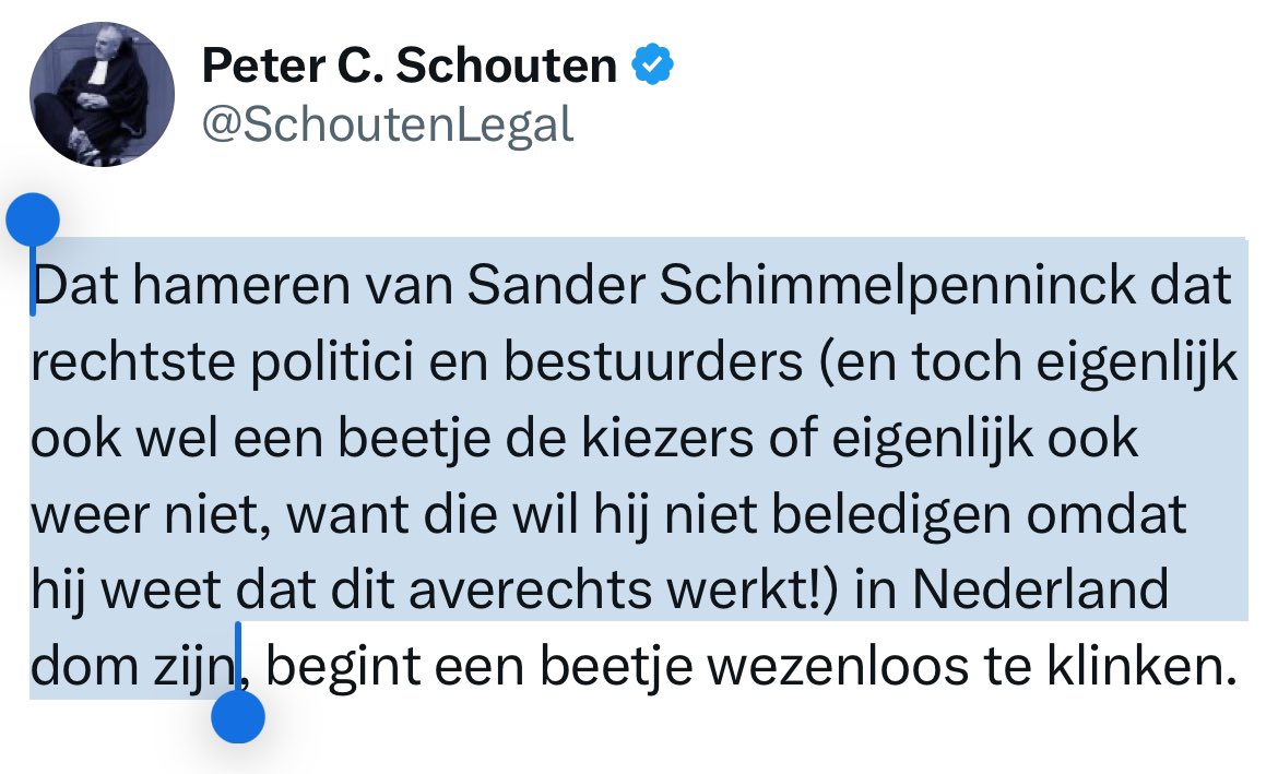 https://twitter.com/schoutenlegal/status/1853719042420363337Met elke zin in die tweet hamert Schouten op zijn eigen domheid. Schouten lijkt niet eens te hebben gehoord, laat staan geluisterd, naar wat Schimmelpenninck zegt. Zie betreffend optreden bij ‘Eva’.