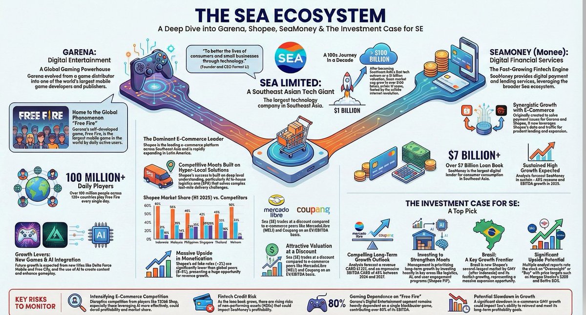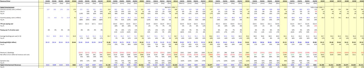 $SE has always historically funded the co with bookings cash coming from Garena. This is a business that we are most excited about near term with the upcoming growth in India, where they were banned/unbanned, etc. Please do your own DD and our forecasts are just for information purposes, not to be relied upon. But these numbers is how one should look at modeling - bookings which is the KEY for Garena. For clarity we have highlighted when India banned Free Fire and the game is expected to be back in 2026 in the country. Some bulls estimate QAUs to reach 1B users w/150M paying users. To provide context -> $SE had in a matter of short period gone from 127M to 730M QAUs w/paying users going from 7M to 93M paying users in 3Q21 (pre-ban)! We dont want to put the cart ahead of the horse but we are fairly confident our 100M paying users by 2030 could prove conservative if management really executes the India/ROW growth.