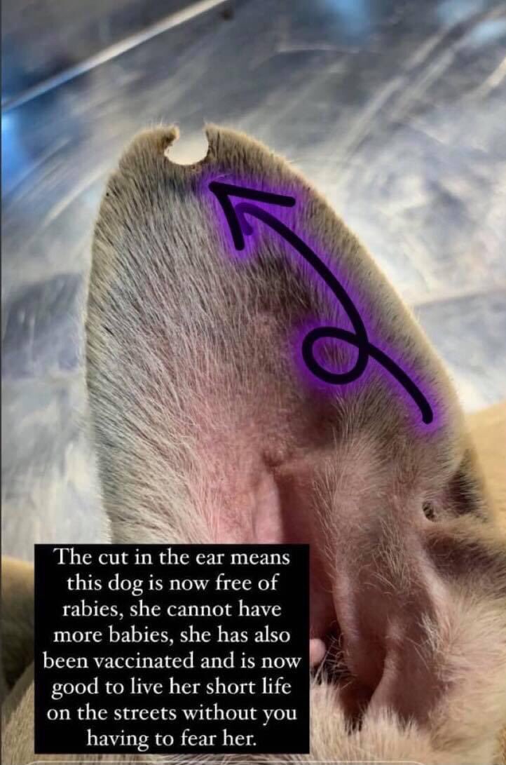 -Dogs which are neutered/spayed to control their reproductive cycle are ear-tipped, so they can’t produce more puppies & the dog population is controlled through humane methods!