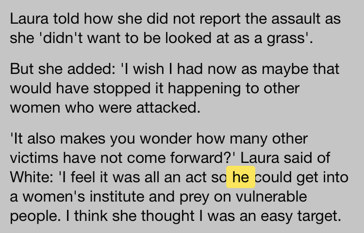 1/3 Brave female prisoner speaks out about being sexually attacked by rapist Karen White in UK women's prison. BUT did @DailyMail alter her quotes to use she/her for White? I highly doubt a sexual assault survivor would refer to her male attacker as a she. dailymail.co.uk/news/article-1…2/3 If so, they missed one web.archive.org/web/2023022704…