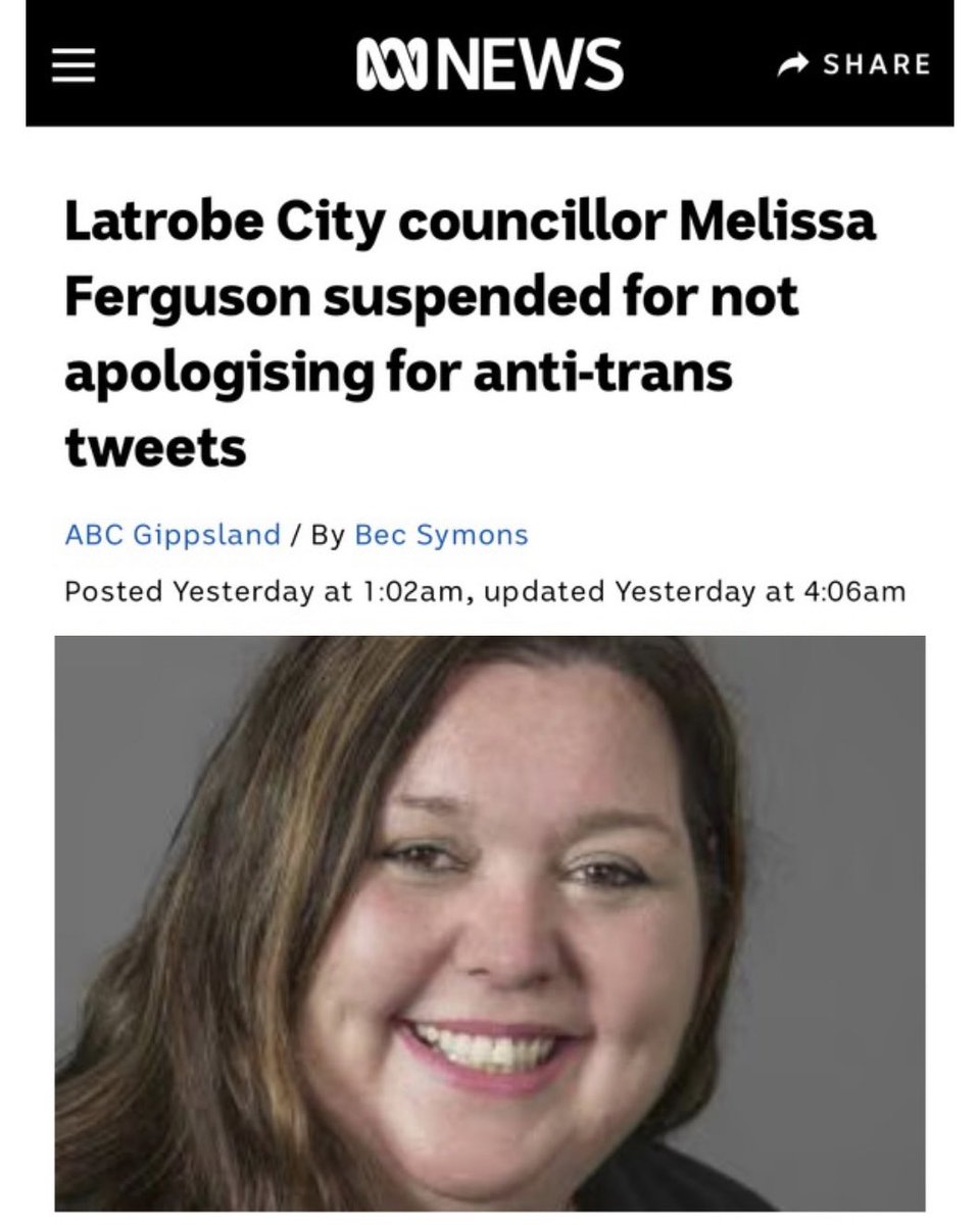 Meanwhile, the councillor who complained about Melissa is being hailed for her 'courage' and @abcnews is of course running the 'anti-trans' line as usual 🙄