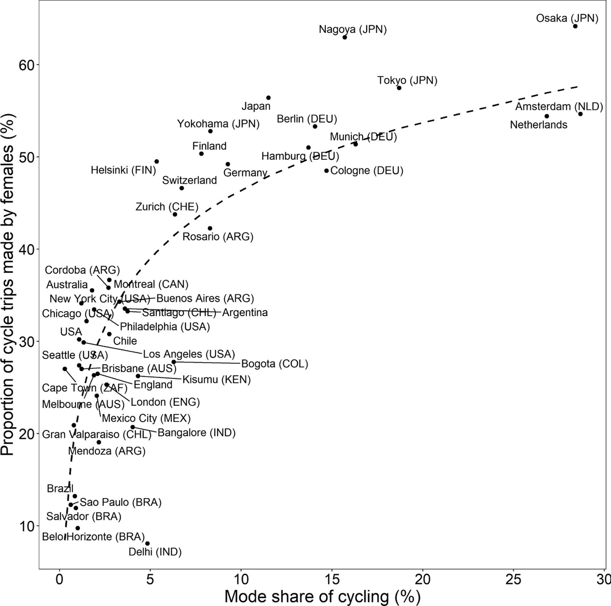 The paper analyses travel survey data from 17 countries across 6 continents! Including from eight megacities (Mexico City, New York City, Bangalore, Tokyo, London, Bogota, Delhi, & Sao Paulo). We looked at cycling levels in relation to distances, purpose, gender & age. (2/7)