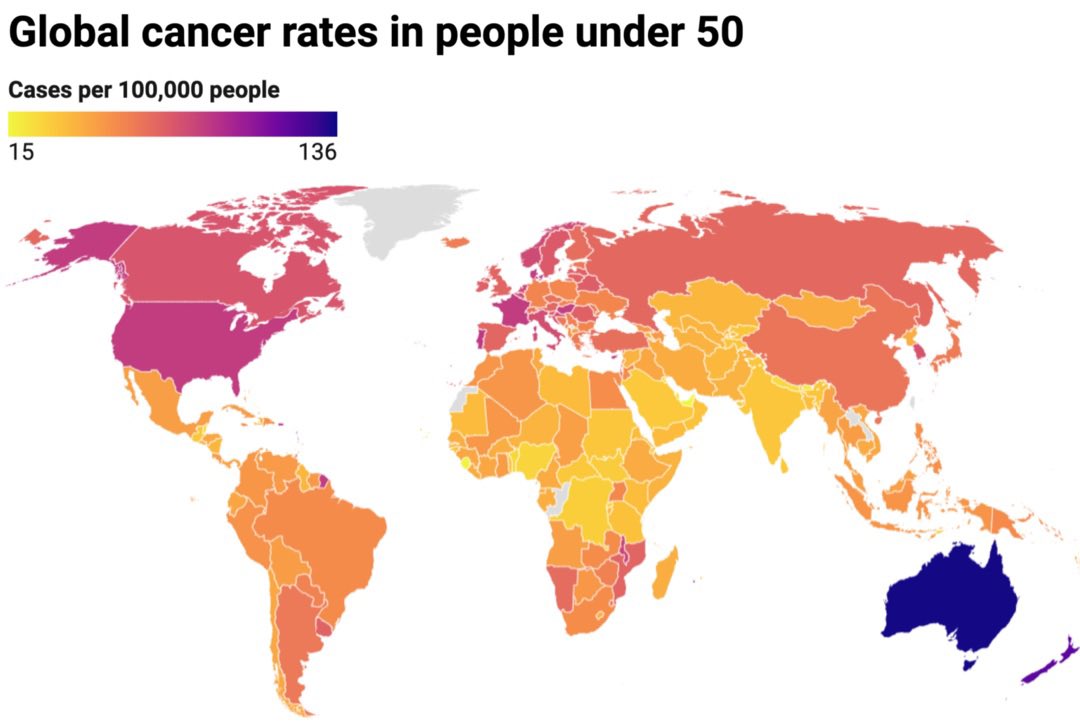 באוסטרליה העלייה הגדולה ביותר בגיל הזה הוא בסרטני המעי והחלחולת. עם עליה של כמעט 500% דווקא באוכלוסיה הצעירה. חלק מההסבר הוא שינוי אורח החיים אצל הצעירים, לחיים יותר יושבניים צריכת סוכר גבוהה וכו, כאשר הגנטיקה מסבירה רק כ20% מהמקרים. השאר זה הסביבה. החלק המעניין הוא שהתמותה>
