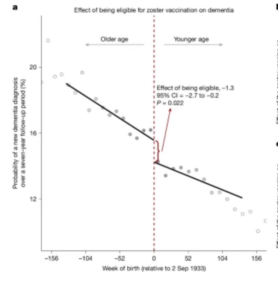 2. לא יכלו לקבל את החיסון. החוקרים השוו בין אנשים שנולדו עד שבוע לפני ה2/9 ועד שבוע אחרי ה2/9. ראשית כ47% מהזכאים התחסנו מול 0.1%, אבל החלק המגניב, היה שנרשמה אצל המחוסנים ירידה של 20% בדמנציה לעומת הקבוצה שלא קיבלה אישור להתחסן (בהפרש שבועות) האפקט הזה היה חזק בנשים מאשר גברים>