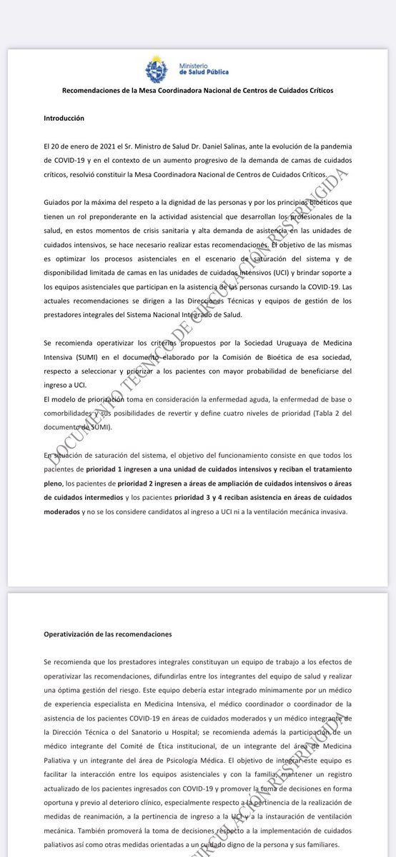 “Se recomienda operativizar los criterios propuestos por @SecretariaSumi en el documento elaborado por la Comisión de Bioética de esa sociedad, respecto a seleccionar y priorizar a los pacientes con mayor probabilidad de beneficiarse del ingreso a UCI” dice el documento.