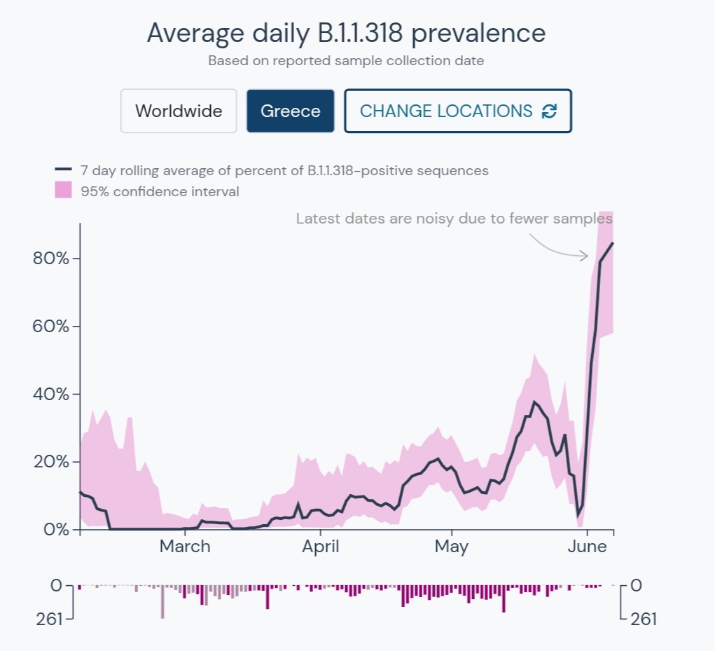 B.1.1.318 has recently increased in prevalence in Greece, and was the dominant variant in genomic sequencing performed during June.