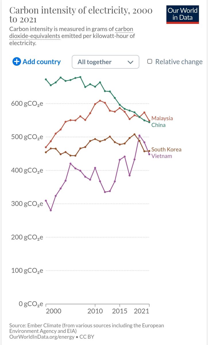 Next, China's electricity carbon intensity is within the ballpark of the other major solar PV panel producers: (includes top 4):