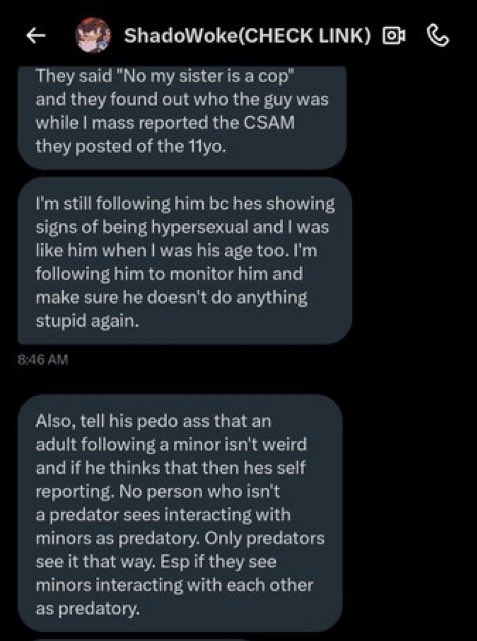 Wolp/shadow the same predator who's DM show she start to follow and control 'monitor' that 11 years old child because he is "being hypersexual" (hypersexual = groomed) just like her.