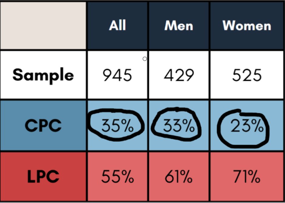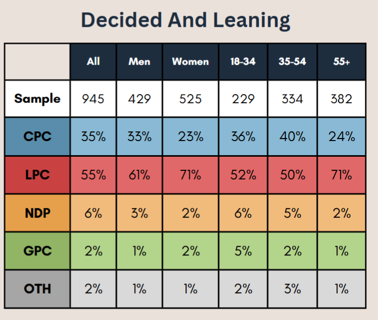In the April 2 riding poll for Eglinton—Lawrence, they reported an overall support of 55% for the Liberals in this riding—61% among men and 71% among women.