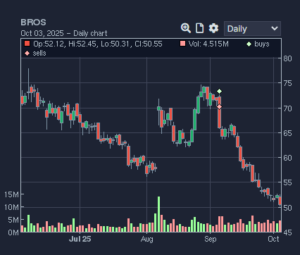 $BROS bought on 9/5 when i thought we were breaking out of a daily bull flag. Using prior day lows as my stop this one quickly failed.