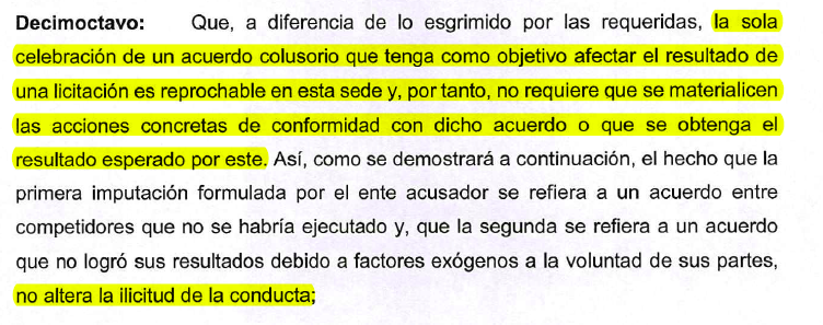 (1) Colusión sin resultados: El mero hecho de celebrar un acuerdo colusorio ya es reprochable. El acuerdo es sancionable aun cuando no se haya cumplido o no haya producido los efectos deseados.
