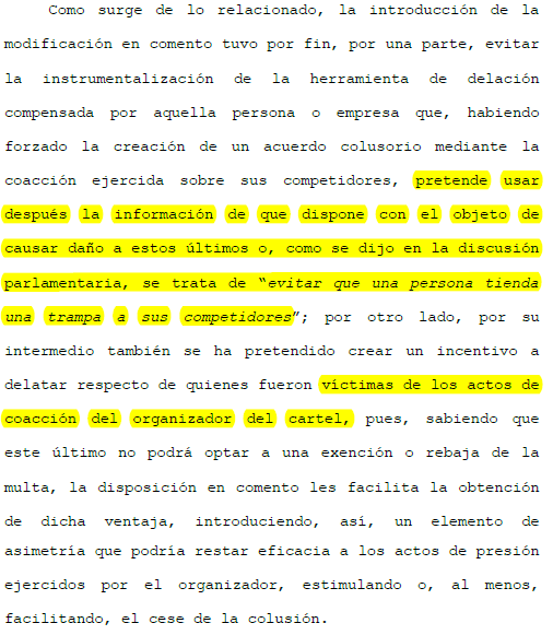 (1) Delación Compensada: El miembro del cartel que se autodenuncie puede eximirse de la multa, salvo que haya coaccionado a otros miembros. Esto evita que el instigador pueda causarles un daño, y permite que las víctimas de la coacción puedan igualmente delatarse.