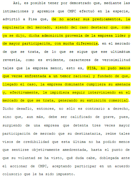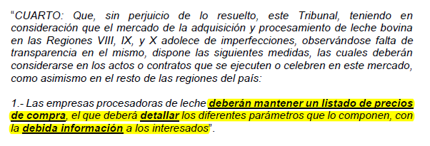 (1) La Sentencia N° 7: En 2004, el TDLC obliga a Nestlé y otras procesadoras de leche (hoy Soprole, Prolesur y Watt's) a publicar "pautas de pago". Las pautas de pago son listas públicas de precios donde deben constar todas las condiciones de compra de leche cruda a lecheros.