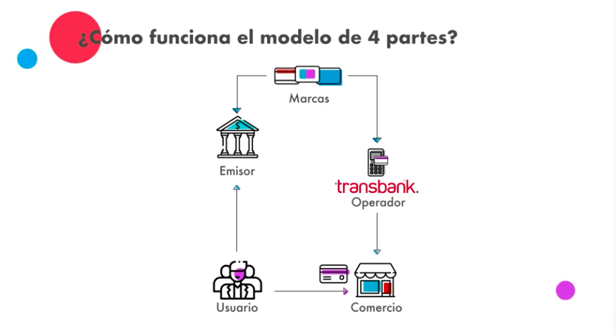 (1) Modelo de 4 Partes (M4P): En el nuevo modelo, la emisión (bancos) y adquirencia (Transbank) se separan. La relación entre emisor y adquirente se realiza mediante las marcas (Visa, Mastercard, Amex). En el antiguo Modelo de 3 Partes (M3P), el switch era provisto por Transbank.