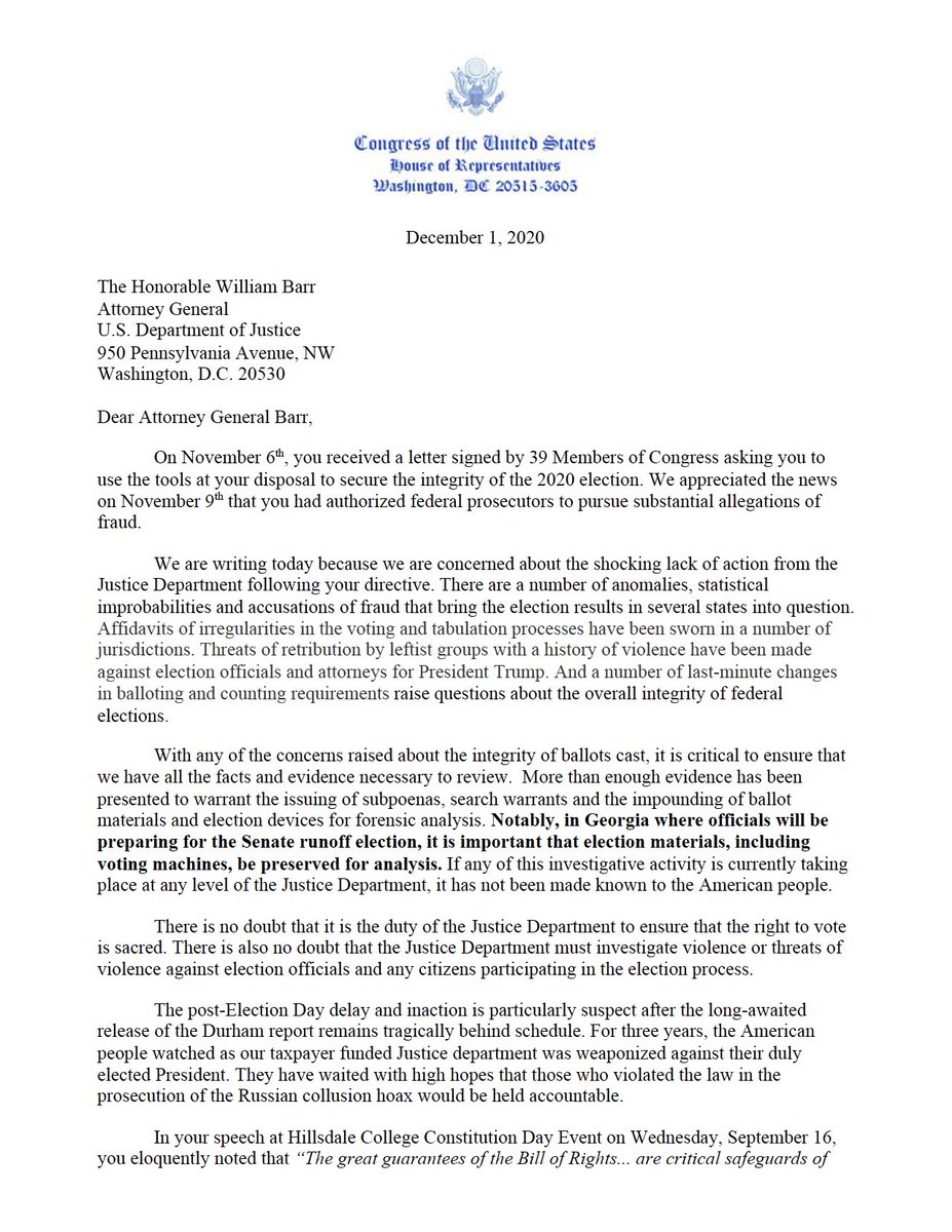There is no doubt it is the duty of @TheJusticeDept to ensure that the right to vote is sacred. There is also no doubt that the DOJ must investigate violence or threats of violence against election officials and any citizens participating in the election process. (2/7)