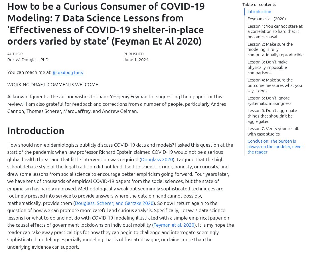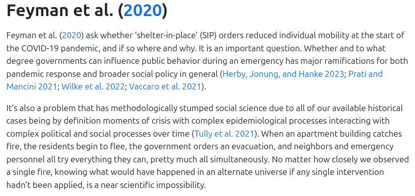 Feyman et al. (2020) ask whether COVID-19 shelter-in-place orders actually kept people inside or if they were ignored and people would have stayed inside anyway.