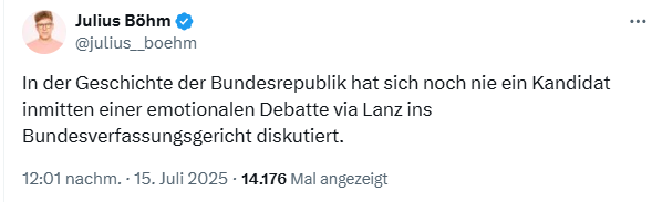 Die Behauptung von Julius Böhm/Nius, dass sich noch nie ein Kandidat für das Bundesverfassungsgericht „via Lanz ins Amt diskutiert“ habe, ist eine polemische Verzerrung, die den Fokus von der eigentlichen Problematik ablenkt.