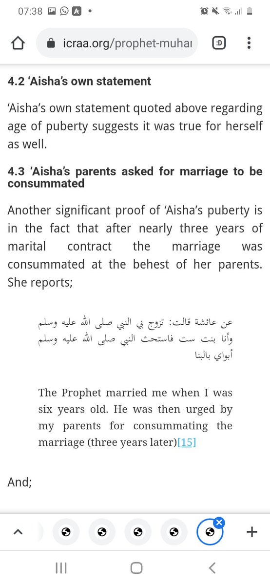 https://twitter.com/XGONDALX/status/1355159376026361858Firstly , 6 years old as narrated in the Hadith literature was the engagement .And 3 year later , Aisha's parents urged the Prophet SWS to marry and consummate his marriage with Aisha RA .