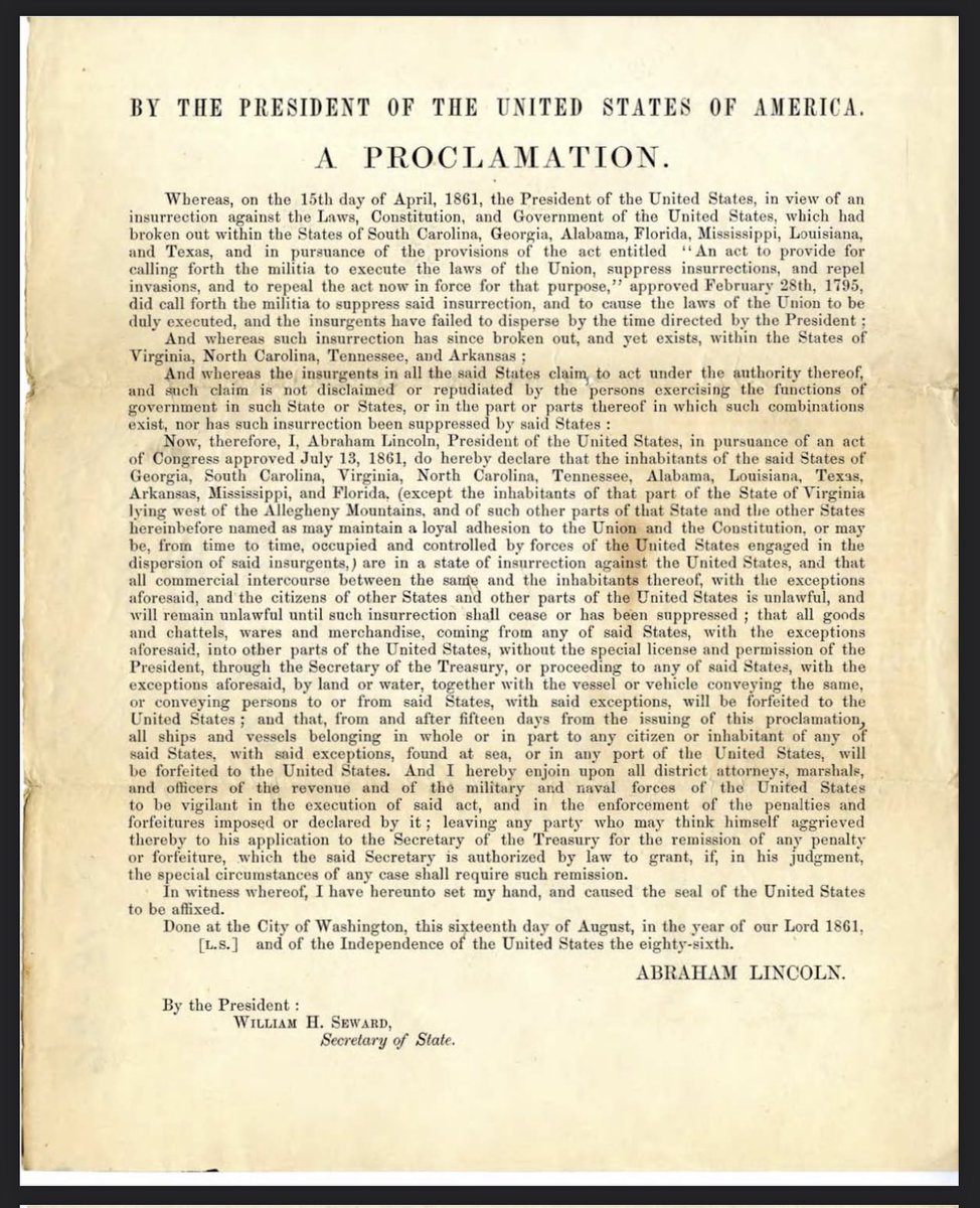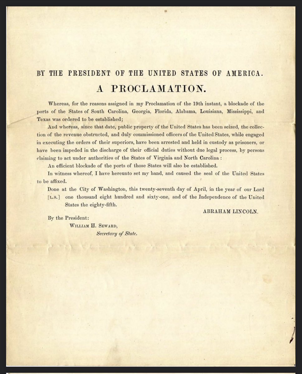 https://twitter.com/rowe_derrick/status/1560319243534716933Lincoln ordered the military blockade of Southern ports.