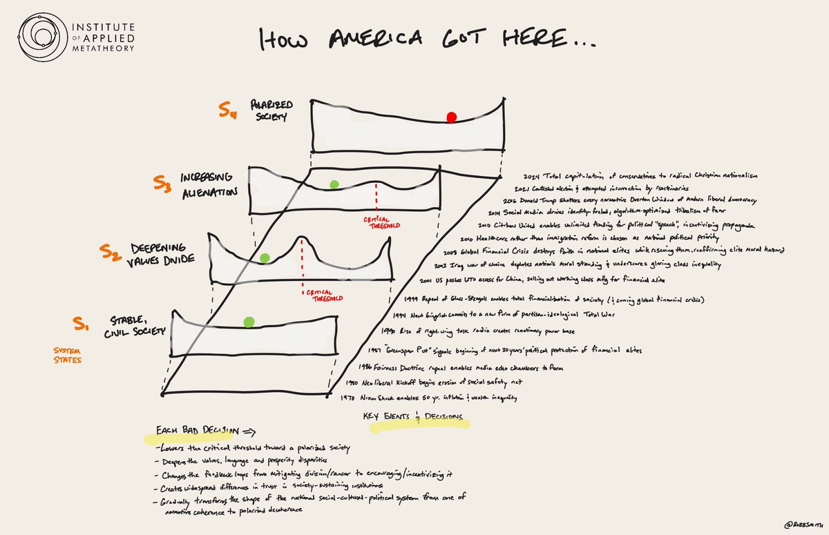 P.S. In case anyone is wondering, I struggled in that small space with how to demonstrate the seeming paradox between the social discord and protest riots of 1968 with the "stable, civil society" I start with in 1970. The basic idea is that even though the values of the nation were highly-contested, and in a liminal space between FDR's progressivism and Reagan's neoliberalism, there was still a more-or-less unified normative space that allowed for the contest to be assimilated through mostly-normal political processes—hence the system regime is stable even if the surface conditions were volatile. This has changed and we no longer have a shared concurrence on the legitimacy or commitment to our underlying democratic governance model, and so we are/have entered a new system regime.