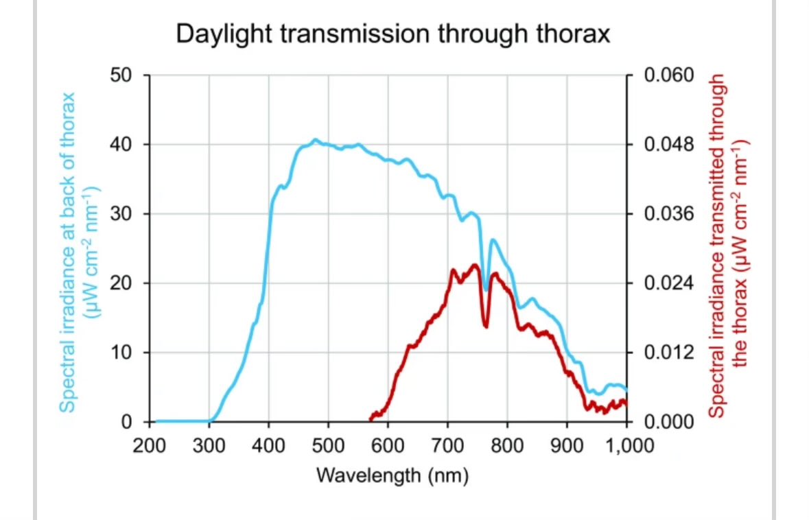 The fact that daylight (blue graph) can go completely through the thorax and be detected on the other side (red graph), should finally answer the question undeniably that sunlight penetrates deeply into the body. Like really deeply. Only the longer wavelengths however can penetrate and be absorbed inside the body - the type not seen in commercial LEDs or on our side of modern windows. This means the only way to get this benefit is to get outside!