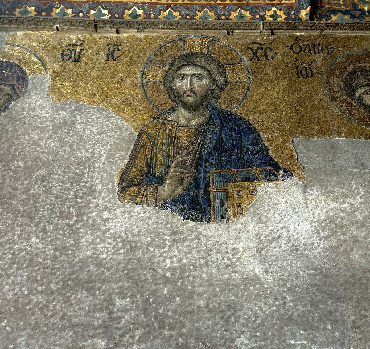 This is the famous Christ Pantokrator from the Hagia Sophia, I chose this image (which I took) because it shows how much of the mosaic is actually gone. We are lucky this excellent portion survived.