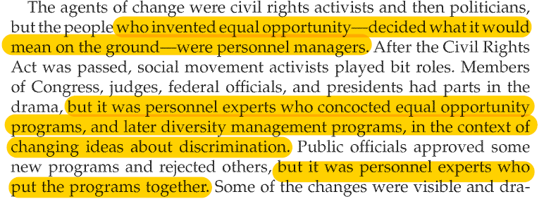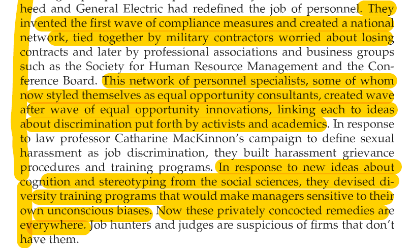 2/ Businesses needed some method to protect themselves against lawsuits, leading to the creation of DEI offices & bureaucracies meant to signal to courts they're in compliance w/ the latest "best practices" in the arena. Those were indirectly imposed on their business environment
