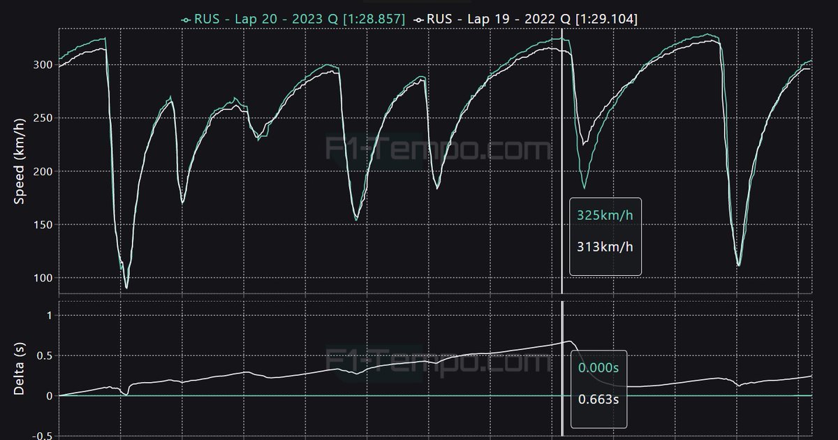 Gat van snelste Mercedes naar pole was zowel in Bahrein als Jeddah kleiner dan vorig jaar. Ook in absolute getallen is Merc sneller dan vorig jaar (zie deltatijden hierboven), terwijl pole-ronde in Jeddah dit jaar fractie langzamer was dan vorig jaar door aangepaste bocht 22 #F1