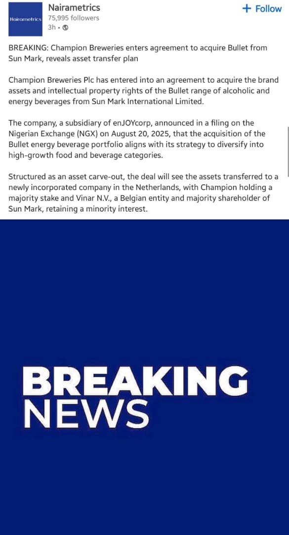 Champion Breweries has agreed to acquire the Bullet brand assets (both alcoholic and energy beverages) from Sun Mark International Limited (a British FMCG coy).